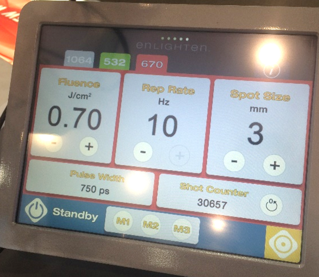エンライトンⅢは「波長」を3種類搭載しています。上の操作画面のように「1064nm」「532nm」「670nm」の3つです。それぞれ